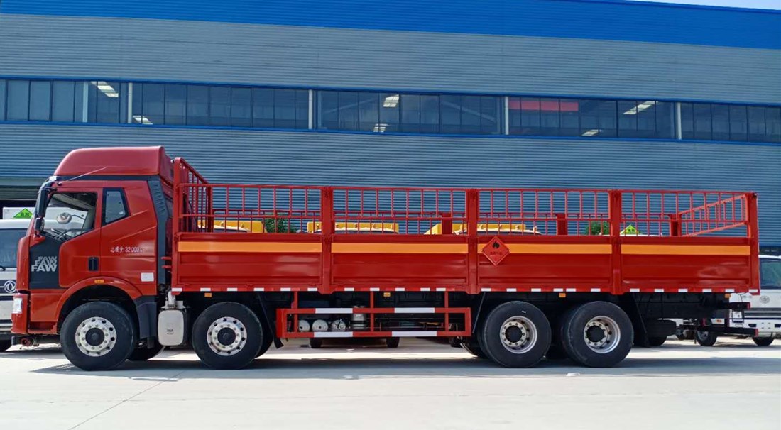 该车适用于运输危险品为危险货物运输车。主要用于运输具有**容器(瓶)包装的液化石油气,丁烷,乙炔,乙烷,丙烷,丁烯,打火机或打火机加油器,二氧化碳,压缩氧(氮,空气,氦,氩,氖),类项号:2.1,2.2。该车运输的介质为2.1项易燃气体时,车辆采用”易燃气体”标识牌,运输的介质为2.2项非易燃无毒气体时,车辆采用”不燃气体”标识牌。整车长/轴距/前悬/后悬对应关系为(mm):11995/1950+4550+1350/1460/2685,11995/1900+4500+1350/1500/2745,11995/1900+4200+1350/1500/3045,11995/2**+4000+1350/1460/3085。仅采用底盘子午线轮胎和带ABS的底盘,该车前轮安装盘式制动器,前置排气管,装配限速装置,限速79km/h。安装带有卫星定位功能的行驶记录仪。专用装置为固定用卡槽。侧防护和后防护装置材料材质为Q23**碳钢,侧防护与厢体底部焊接连接,后防护装置与车架采用焊接连接。后防护截面尺寸(mm):120×50,离地高度为470mm。采用发动机型号CA6DK1-28E5,CA6DK1-32E51,CA6DL1-32E5对应油耗值分别为油耗 (L/**km):43.71,45.5,42.09。ABS系统生产厂家:浙江万安科技股份有限公司,型号:VIE ABS-Ⅱ。随底盘选装驾驶室。后轴采用空气悬架。 该车后轴为采用空气悬架. |