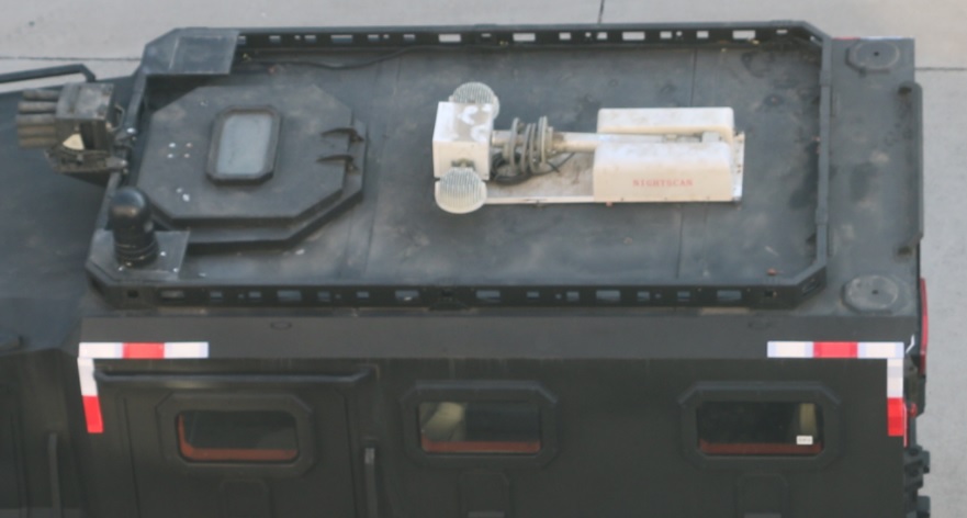 专用作业装置防暴前杠,选装催泪发射器、云台摄像机、倒伏升降灯,倒伏升降灯仅在停车作业时开启,行驶状态不可开启,选装倒伏升降灯的高度为2615mm,选装催泪发射器或云台摄像机的高度为2760mm,用于执行安全巡逻任务或平息群体突发事件。侧防护为车辆构件代替,材料为Q235钢管;后防护材料Q235钢板,截面尺寸:135mm×55mm,离地高度340mm,连接方式:螺栓连接于底盘主梁上。ABS系统的型号/生产厂家:CM0953YK/广州瑞立科密汽车电子股份有限公司,CM9003YK/广州瑞立科密汽车电子股份有限公司。该车型选装ETC车载装置,后部车厢内座椅不核定人数。