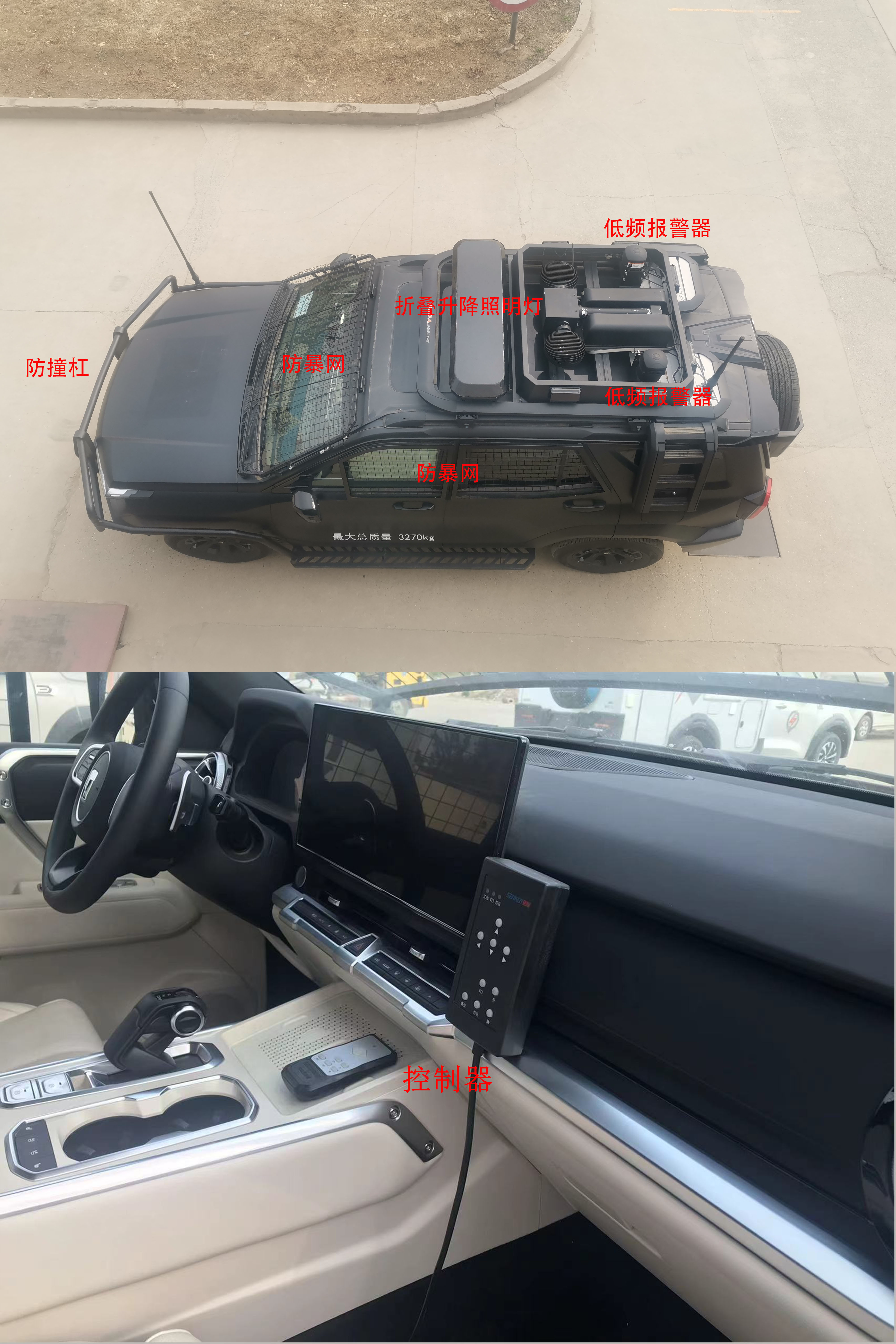 该产品为新能源车辆,新能源类型为插电式混合动力.ABS型号:IPB;ABS生产企业:博世汽车部件(苏州)有限公司;E20NB发动机净功率值:180kW,WLTC燃料消耗量(L/100km)2.39;储能装置种类:镍钴锰三元锂蓄电池;储能装置单体/总成生产企业:蜂巢能源科技股份有限公司,蜂巢能源科技(湖州)有限公司,蜂巢能源科技(遂宁)有限公司/蜂巢能源科技股份有限公司,蜂巢能源科技(南京)有限公司,蜂巢能源科技(遂宁)有限公司;专用功能及装置:该车主要专用装置:车辆装配防暴网、防撞杠、折叠升降照明灯(行驶过程中不点亮,仅在作业时使用)、低频报警器等专用装置,主要用于处置突发性事件.选装描述:随底盘选装拖钩孔,电连接头,轮辋;其他说明:该车型可选装ETC车载装置,该车配备汽车事件数据记录系统(EDR),该车配备车载视频行驶记录系统(DVR),允许外接充电,准拖挂车总质量:不带制动750kg,带制动2500kg,牵引专用装置:拖钩孔,电连接头,安装牵引专用装置不影响车辆长度.前后悬架形式为:双横臂式螺旋弹簧独立悬架/五连杆式螺旋弹簧非独立悬架.