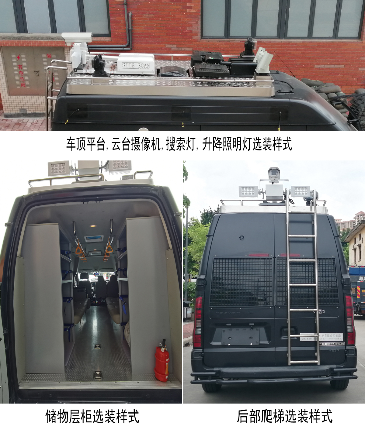 ABS型号: 6C11 2M110 A*或CC11 2C405 A*或EV7021;ABS生产企业:博世汽车部件(苏州)有限公司;安装有限速装置;限速装置限速(km/h):100;发动机净功率值:101KW;选装描述:可选装ETC车载装置;最后排座椅后方安装具有足够强度的板式隔离装置;专用功能及装置:车顶部安装有车顶平台,云台摄像机,搜索灯,宣传广播,升降照明灯,车辆前挡风玻璃,左右侧窗都安装有防暴钢网,前挡风钢网,车辆前部有防撞保险杠,车辆后部有后保险杠和后踏步,车辆尾部安装有储物层柜,用于存放处突装备和巡逻设备,车尾门安装有爬梯;;其他说明:该车主要用于在各种工况下的现场数据收集、数据传输、数据接收、防暴运兵、巡逻、处突、装备运输、宣传广播等功能,不装前防撞保险杠和后踏步时整车长5780,前悬933,后悬1097,装有前防撞保险杠和后踏步时整车长6077,前悬1120,后悬1207,装有前防撞保险杠和后保险杠时,整车长5990,前悬1120,后悬1120,顶高(车高2660mm,VIN号为LJXBMDJD;车高2890mm,VIN号为LJXBHDJD); | |||