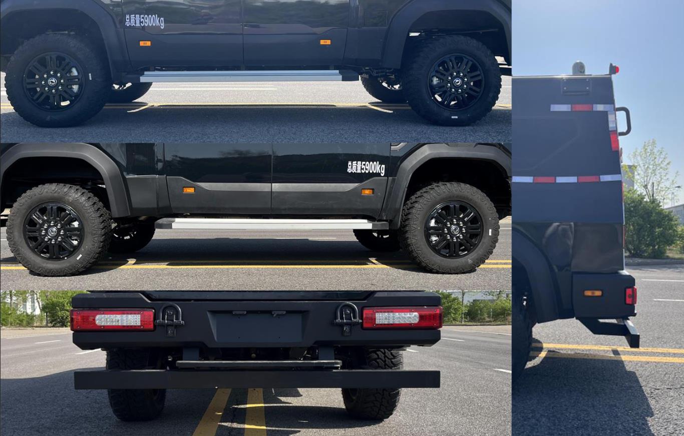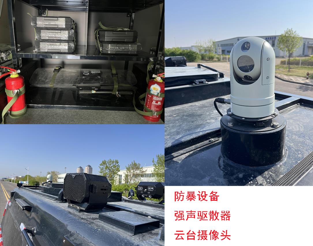 该车配备防暴装备,强声驱散器等专用设备,用于暴力事件现场快速突击处理.后防护装置截面尺寸(高×宽):100×60mm,离地高度为425mm,材质为Q235B,螺栓连接到底盘纵梁.侧防护为车身结构代替.ABS系统的型号/生产厂家:CM0953YK/广州瑞立科密汽车电子股份有限公司或CM9003YK/广州瑞立科密汽车电子股份有限公司.发动机D6.7NS6B320最大净功率为226kW.车顶辅助照明灯具仅在停车作业状态下使用. | |||