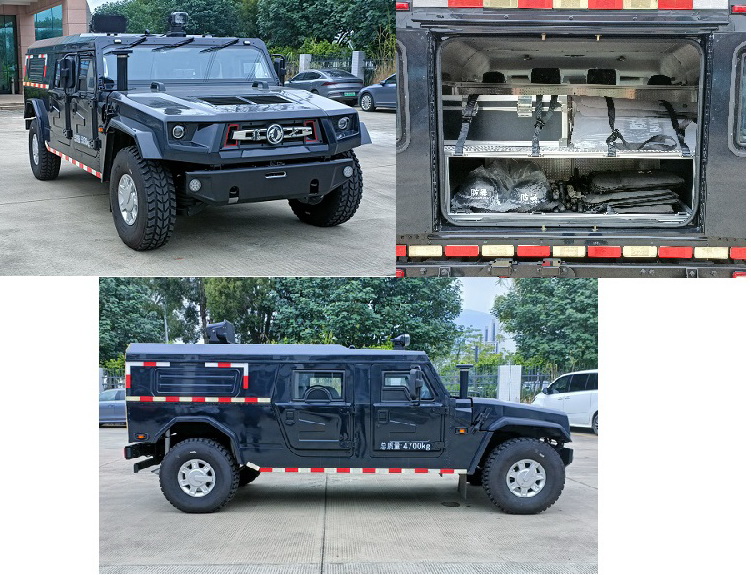 主要专用装置:声波驱散器、防弹防护材料、强光照明灯、云台摄像机、搜索灯、扬声器、集群台、喊话器、装备架、警棍、防刺服、头盔、钢叉、防暴盾牌等,主要用于执行安全巡逻任务或平息群体突发事件;侧面防护为整体裙部,离地高520mm;后下防护材质为DL590,螺栓连接,断面尺寸100×50mm,离地高495mm;随底盘选装ETC车载装置、驾驶室准乘人数,中顶、低顶车身;选装中顶,车长5410,后伸量90,离去角30,整备质量4640,选装不带声波驱散器时,车高2545,选装不带声波驱散器和扬声器时,车高2420;选装低顶车长5320,离去角32,整备质量4440,选装不带声波驱散器时,车高2220,选装不带声波驱散器云台摄像机搜索灯时,车高2170;ABS型号: YF8、 CM0953YK,生产企业: 武汉元丰汽车电控系统有限公司、广州瑞立科密汽车电子股份有限公司;发动机最大净功率:138kW 。