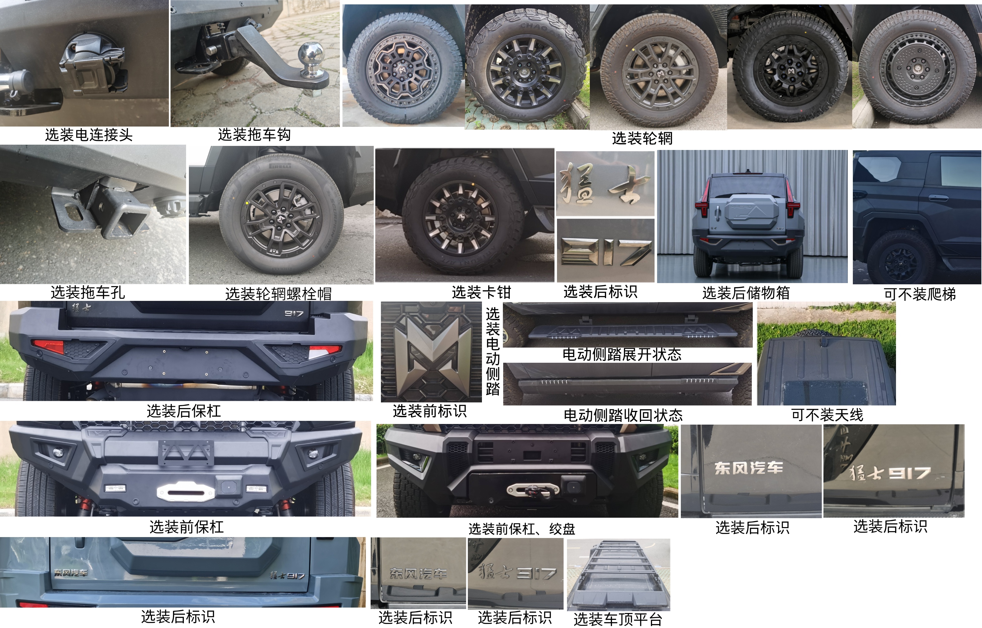 可随原车选装车顶平台、后储物箱、轮辋、卡钳、后标识、前标识、绞盘、电动侧踏、前保杠、外饰件、后保杠、电连接头、拖车钩、拖车口、轮辋螺栓帽、可不装天线、可不装爬梯;该车允许外接充电,储能装置种类:三元锂离子蓄电池,储能装置单体的生产企业:宁德时代新能源科技股份有限公司,储能装置总成的生产企业:东风时代(武汉)电池系统有限公司。发动机最大净功率为140kW。ABS型号及生产厂:IBC/采埃孚汽车科技(上海)有限公司。该车配备汽车事件数据记录系统(EDR);该车型可选装ETC车载装置,且为直接供电ETC。主要专用装置及功能:声波驱散器、催泪弹发射器、装备柜、车载智能巡逻终端、阻车钉抛洒器,能实现车牌采集,车辆抓拍,人脸抓拍,语音对讲,信息上传等功能,主要用于执行安全巡逻任务和处理突发事件。 | |||