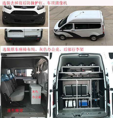 ABS型号:EV5051,ABS生产企业:博世汽车部件(苏州)有限公司,发动机最大净功率为147kW;专用功能及装置:车辆装配办公桌、云台摄像机、装备柜、防暴网等专用装置,主要用于处置突发性事件;该车可选装去掉防撞保险杠、车顶摄像机后长度为4974mm,高度为2407mm,前悬/后悬(mm)为1014/1027,整备质量在3%范围内.该车配备汽车事件数据记录系统(EDR);该车可选装ETC车载装置。