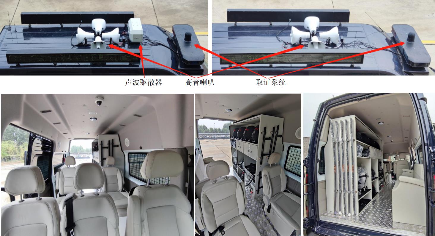 车辆装配云台、防暴网、头盔、警棍、盾牌等专用装置,用于处置突发性事件。选装车顶专用装置:电子屏、高音喇叭、调查取证系统、声波驱散器(可去掉);内部布局、保留原车5座、装备柜样式,整备质量变化在3%范围内。ABS系统控制器型号:6C11 2M110 A*或CC11 2C405 A*或EV7021,生产厂家:博世汽车部件(苏州)有限公司。发动机最大净功率为101kW。该车可选装ETC车载装置。