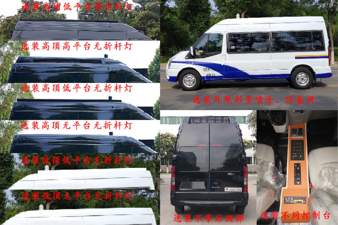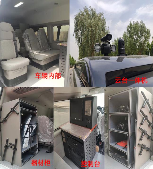 该车配备云台一体机,器材柜等专用装置,主要用于预防和处置各种群体性事件,打击恐怖活动,具有一定的自身防护能力的专用车辆.该车随原车选装低顶状态,该车高顶高平台带折杆灯时高度为3200mm,该车高顶低平台带折杆灯时高度为3040mm,高顶高平台无折杆灯时高度为2990mm,高顶低平台无折杆灯时高度为2830mm,高顶无平台时高度为2780mm,低顶低平台时高度为2640mm,低顶无平台时高度为2560mm.4-6座时整备质量为2550kg,7-9座时整备质量为2600kg.选装不带后部爬梯.选装不同控制台.选装防暴网.选装顶置式空调.该车型可选装直接供电式ETC车载装置.该车配备汽车事件数据记录系统(EDR).ABS型号/生产厂:6C11 2M110 A*或CC112C405 A*/博世汽车部件(苏州)有限公司.发动机最大净功率101kW.