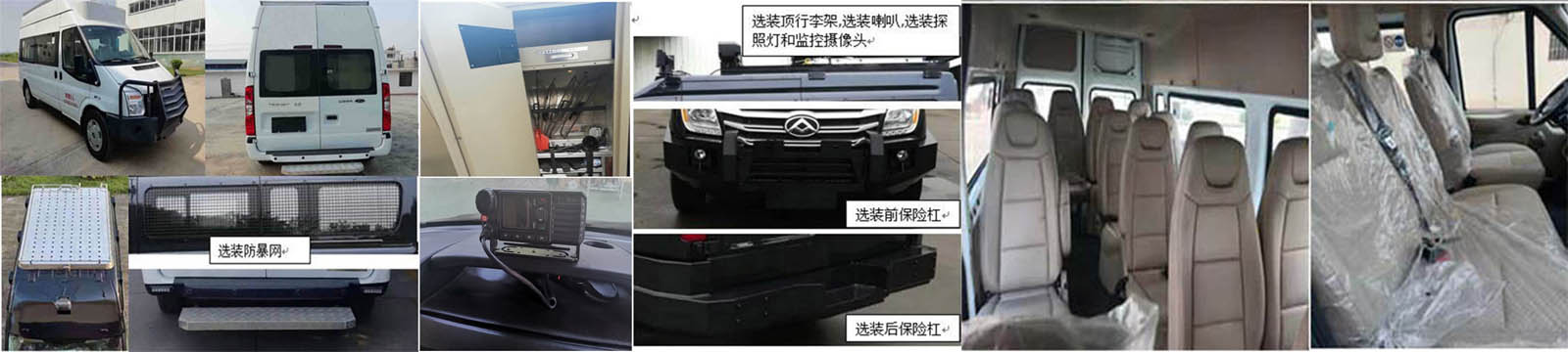 ABS型号:6C11 2M110 A*或CC11 2C405 A*或EV 7021;ABS生产企业:博世汽车部件(苏州)有限公司;发动机净功率值:101kw;选装前后保险杠时车长为5995mm,对应前后悬为933/1312mm选装后踏板时车长为6150mm,对应前后悬为933/1467mm,选装车顶平台时高为2720mm,选装车顶围栏时高为2820mm,选装照明灯,伸缩梯固定装置时高为2970mm,选装防暴网,器材柜,后爬梯,顶行李架,喇叭,探照灯,监控摄像头;专用功能及装置:超短波电台,器材柜,主要用于防爆;该车装备行驶记录仪,选装直接供电式ETC装置.随底盘选装:前大灯,后尾灯,前脸造型,号牌板支架,车门两侧不带英文装饰条,尾部外部标识,轮辋,车身同色后视镜,车身同色门把手及钥匙孔,侧推拉窗. | |||