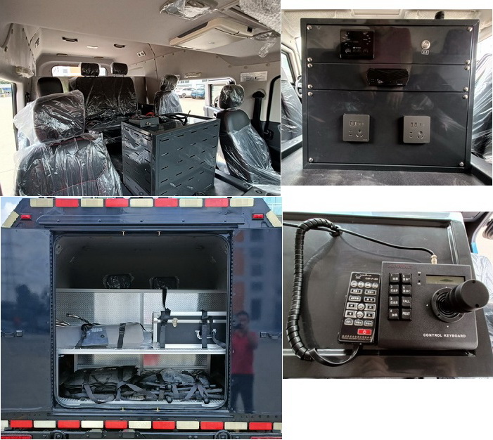 主要专用装置:声波驱散器、防弹防护材料、强光照明灯、云台摄像机、搜索灯、扬声器、集群台、喊话器、装备架、警棍、防刺服、头盔、钢叉、防暴盾牌等,主要用于执行安全巡逻任务或平息群体突发事件;侧面防护为整体裙部,离地高520mm;后下防护材质为DL590,螺栓连接,断面尺寸100×50mm,离地高495mm;随底盘选装ETC车载装置、驾驶室准乘人数,中顶、低顶车身;选装中顶,车长5410,后伸量90,离去角30,整备质量4640,选装不带声波驱散器时,车高2545,选装不带声波驱散器和扬声器时,车高2420;选装低顶车长5320,离去角32,整备质量4440,选装不带声波驱散器时,车高2220,选装不带声波驱散器云台摄像机搜索灯时,车高2170;ABS型号: YF8、 CM0953YK,生产企业: 武汉元丰汽车电控系统有限公司、广州瑞立科密汽车电子股份有限公司;发动机最大净功率:138kW 。 | |||