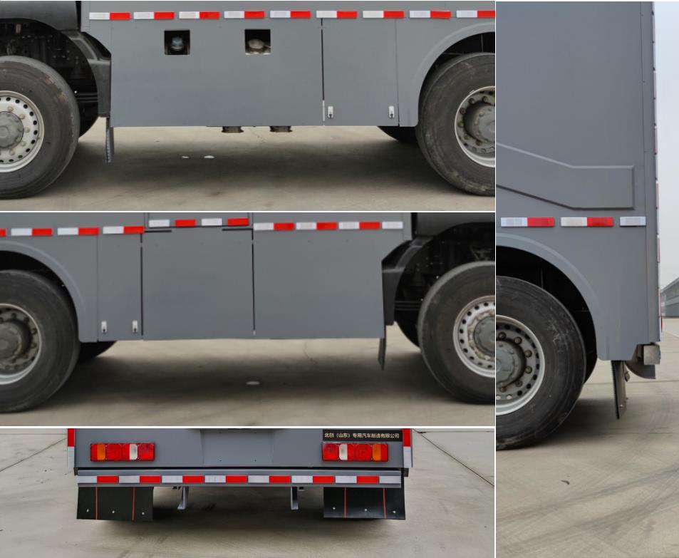 厢体顶部封闭不可开启。该车装置防暴装备、防爆罐,用于群体性、突发性事件现场快速突击处理。后防护材质为Q235A,螺栓连接到纵梁,截面尺寸(高×宽):120×100mm,离地高度为460mm。侧防护为裙边结构,材质为Q235A,焊接到厢体上。安装EBS,EBS系统控制器生产企业为采埃孚商用车系统(青岛)有限公司,EBS系统控制器型号为EBS3。发动机MC07H.35-60的净功率为254kW。仅选用3600mm轴距底盘。该车可选装ETC车载装置。