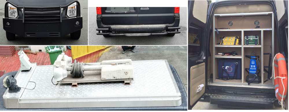 ABS型号: 6C11 2M110 A*或CC11 2C405 A*或EV7021;ABS生产企业:博世汽车部件(苏州)有限公司;安装有限速装置;限速装置限速(km/h):100;发动机净功率值:101KW;选装描述:可选装ETC车载装置;最后排座椅后方安装具有足够强度的板式隔离装置;专用功能及装置:车顶部安装有车顶平台,云台摄像机,搜索灯,宣传广播,升降照明灯,车辆前挡风玻璃,左右侧窗都安装有防暴钢网,前挡风钢网,车辆前部有防撞保险杠,车辆后部有后保险杠和后踏步,车辆尾部安装有储物层柜,用于存放处突装备和巡逻设备,车尾门安装有爬梯;;其他说明:该车主要用于在各种工况下的现场数据收集、数据传输、数据接收、防暴运兵、巡逻、处突、装备运输、宣传广播等功能,不装前防撞保险杠和后踏步时整车长5780,前悬933,后悬1097,装有前防撞保险杠和后踏步时整车长6077,前悬1120,后悬1207,装有前防撞保险杠和后保险杠时,整车长5990,前悬1120,后悬1120,顶高(车高2660mm,VIN号为LJXBMDJD;车高2890mm,VIN号为LJXBHDJD);