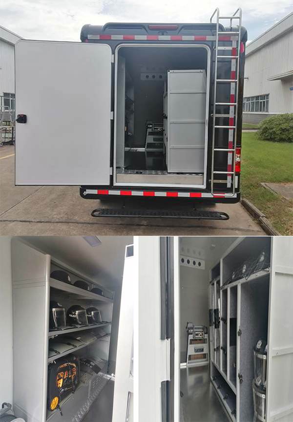 随底盘选装新前脸造型.选装尾部爬梯.选装车顶升降照明灯高2860mm,选装单侧遮阳棚宽2200mm,选装双侧遮阳棚宽2240mm.ABS型号:6C11 2M110 A*或CC11 2C405 A*或EV7021,生产厂家:博世汽车部件(苏州)有限公司;发动机净功率值:101KW;发动机对应关系为:DURATORQ4D226H;选装轻质设备柜材料时对应的总质量/整备质量(kg):3510/3315.所用材料材质、连接方式以及后部防护装置的主要尺寸参数(断面尺寸和离地高度):侧防护及后防护为裙边结构,侧防护裙边离地最大距离为350mm,后防护裙边离地最大距离为400mm;车厢顶部封闭且不可开启;专用功能及装置描述:设备柜、防暴头盔、盾牌、车顶升降照明灯等专用装置;该车型可选装直接供电ETC车载装置