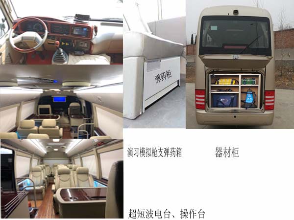 车顶选择装摄像监控系统时,总高2820mm;不安装摄像监控系统时,总高为2620mm。ABS系统型号/生产厂家为:89541-36200/DENSO CORPORATION。该车配备器械存放柜、演习模拟枪支弹药箱、超短波电台等,主要用于官兵运送。发动机最大净功率为151kW,油耗15L/100km。该车应装具有卫星定位功能行驶记录仪。 | |||