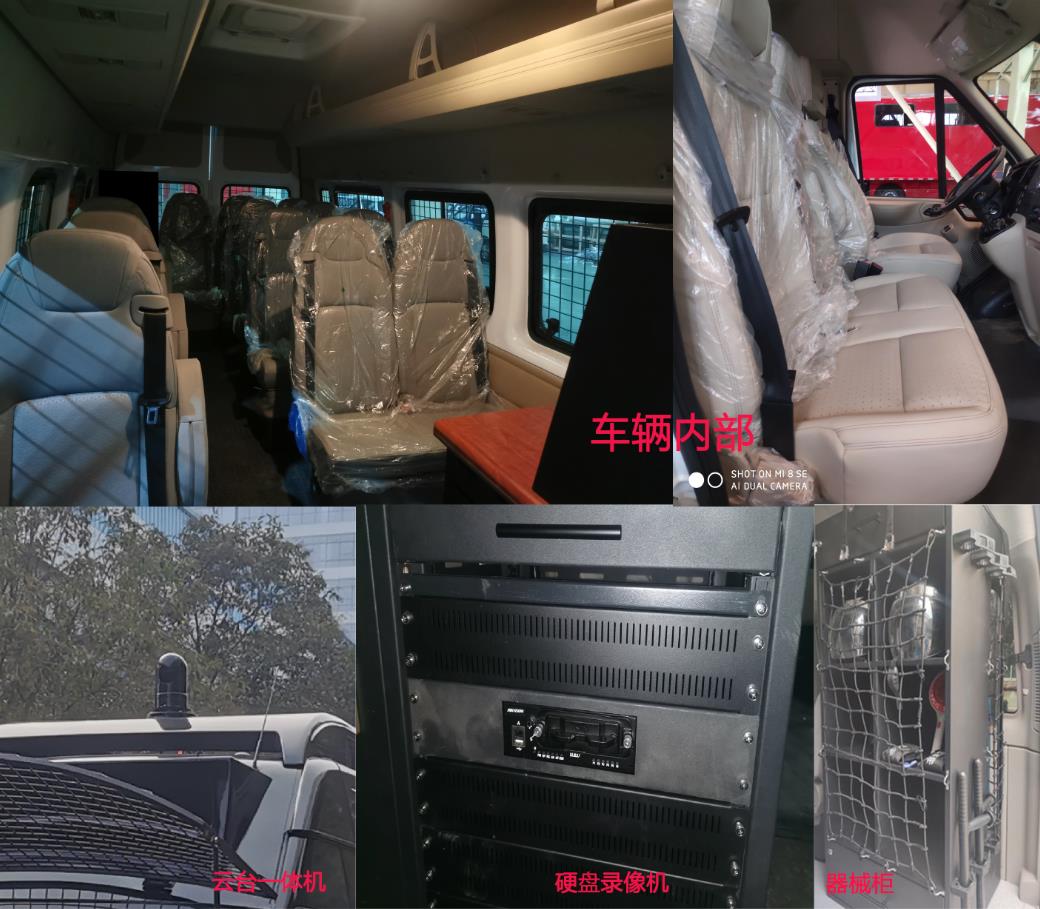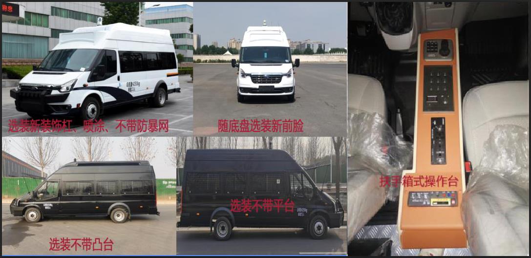 该车配备云台一体机、硬盘录像一体机、器械柜等专用装置,主要用于运输警力;选装不带凸台,选装喷涂,选装不带平台对应高度2860mm,选装不带防暴网.车辆为老前部造型时整车长度为6720mm,对应油耗为9.1L/100km.车辆为新前部造型时整车长度为6720mm,对应油耗为8.7L/100km,随底盘选装新前部造型时对应长度为6543mm,对应油耗为8.7L/100km;选装扶手箱式操作台;ABS系统控制器型号: 6C11 2M110 A*或CC11 2C405 A*或EV7021,生产厂家:博世汽车部件(苏州)有限公司.发动机最大净功率为101kw.该车型可选装直接供电式ETC车载装置.该车配备汽车事件数据记录系统(EDR).该车安装带卫星定位功能的行驶记录仪. | |||